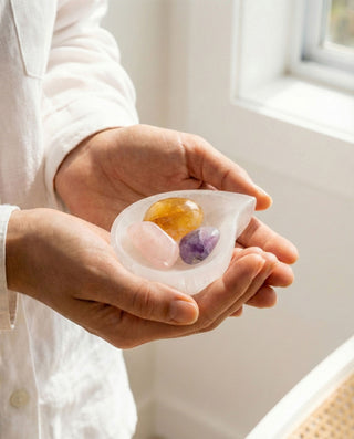Ontdek alles over bergkristal: spirituele werking, chakra's, combinaties met andere stenen én hoe je hem eenvoudig reinigt en oplaadt met seleniet.