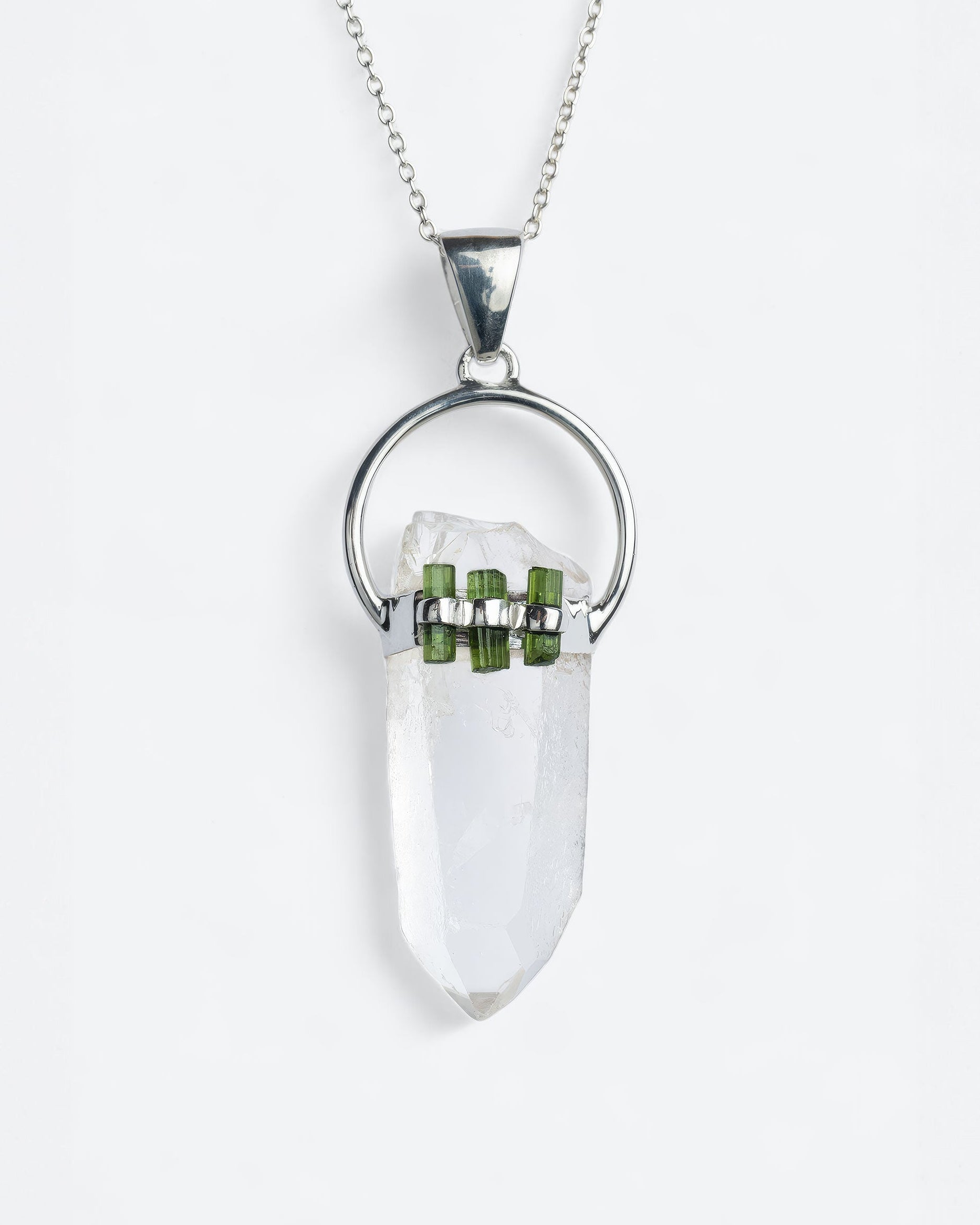 Zilveren hanger met Lemurisch kristal (wijsheid) en Groene Toermalijn (hartkracht). Deze harmonieuze combinatie opent het hart, bevordert emotioneel herstel en versterkt je verbinding met hogere energieën. Een verfijnd sieraad dat zuivering en groei ondersteunt.