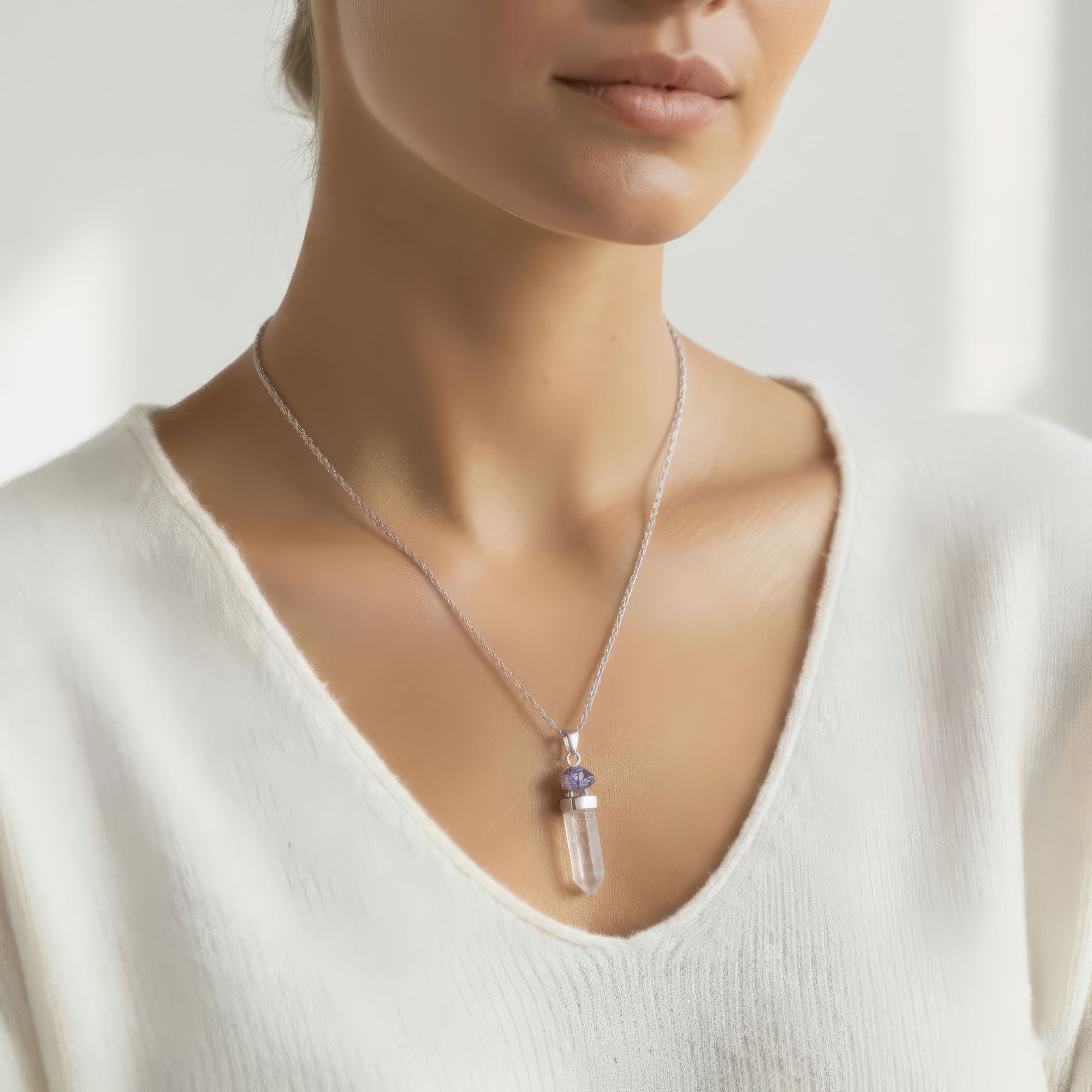 Zilveren hanger met Lemurisch kristal (wijsheid) en Tanzaniet (inzicht). Deze verfijnde combinatie opent je derde oog, versterkt intuïtie en brengt rust in hoofd en hart. Een bijzonder sieraad voor spirituele helderheid en innerlijke balans.