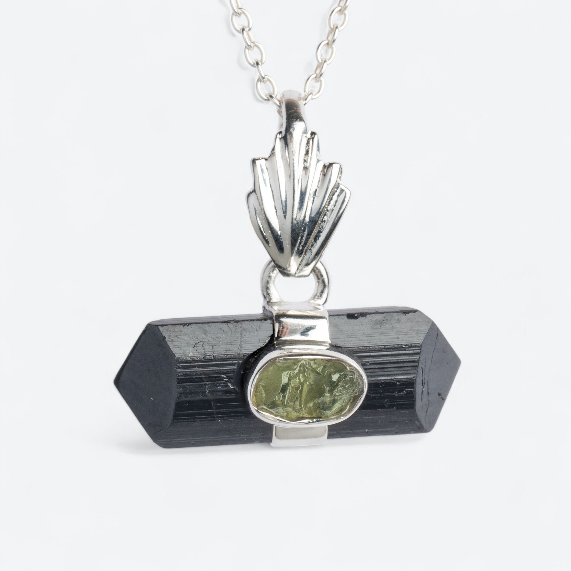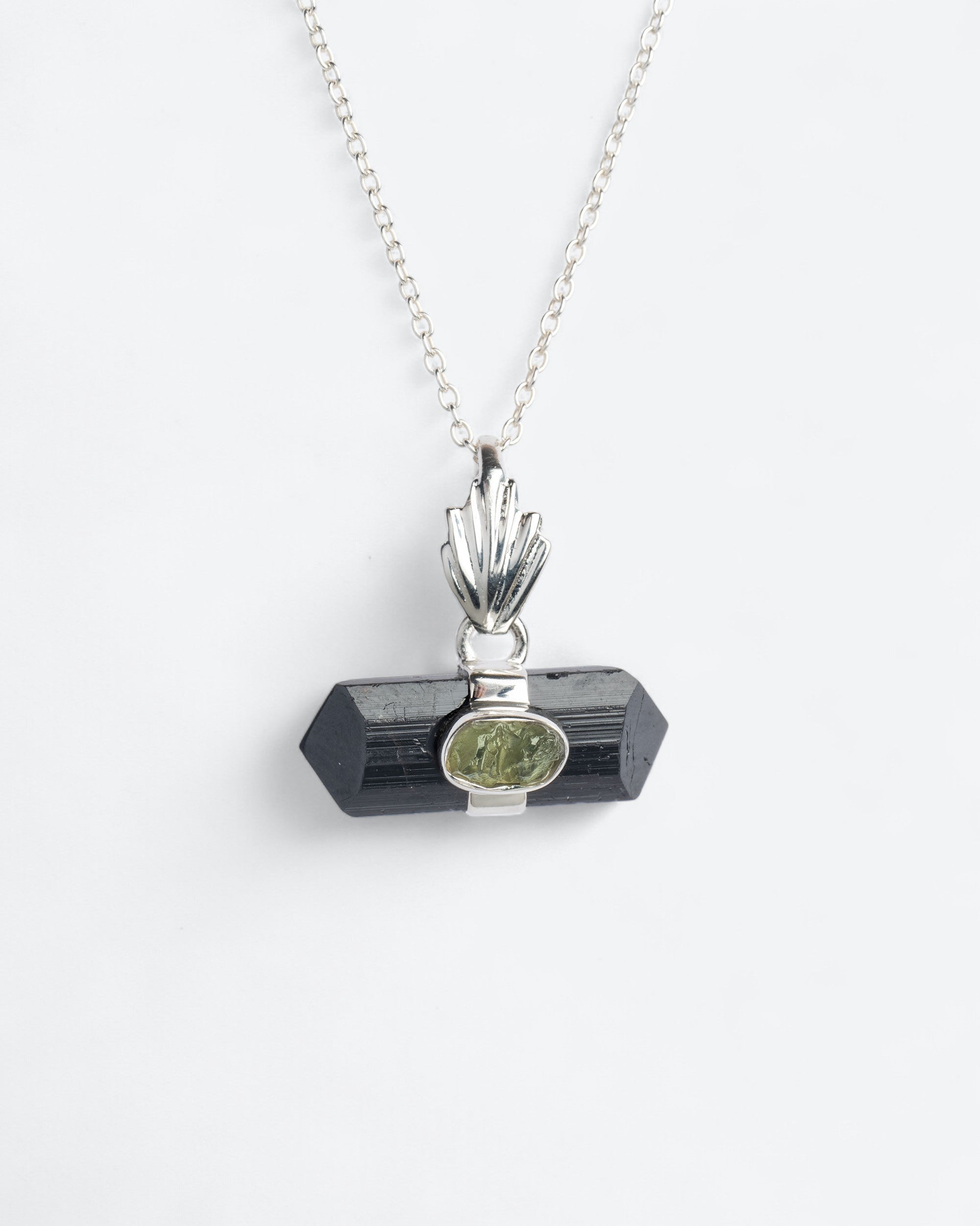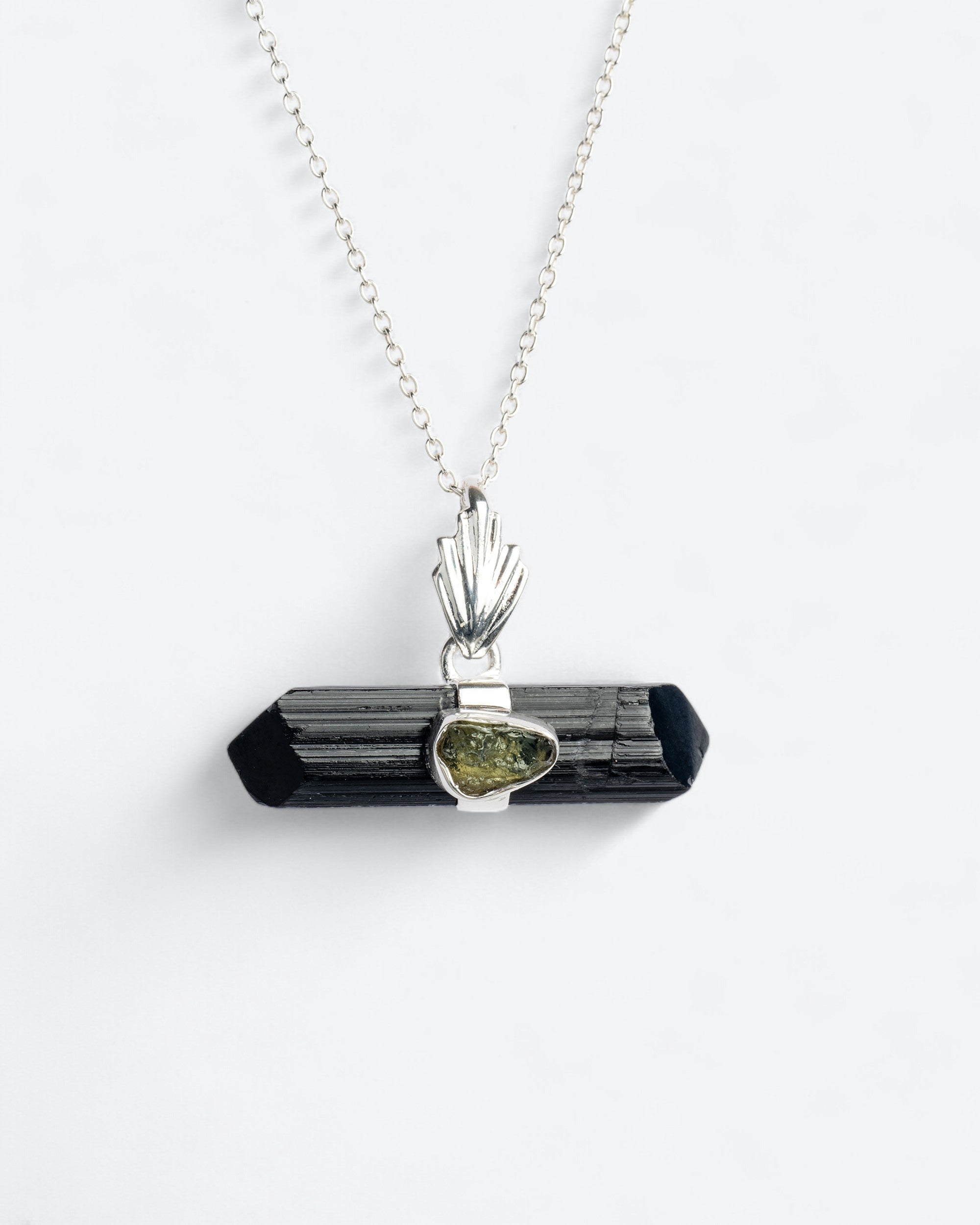 Zilveren hanger met Moldaviet (transformatie) en Zwarte Toermalijn (bescherming). Deze krachtige combinatie helpt je groeien, gronden en oude patronen loslaten. Een harmonische balans tussen licht en aarde – ideaal in tijden van verandering.
