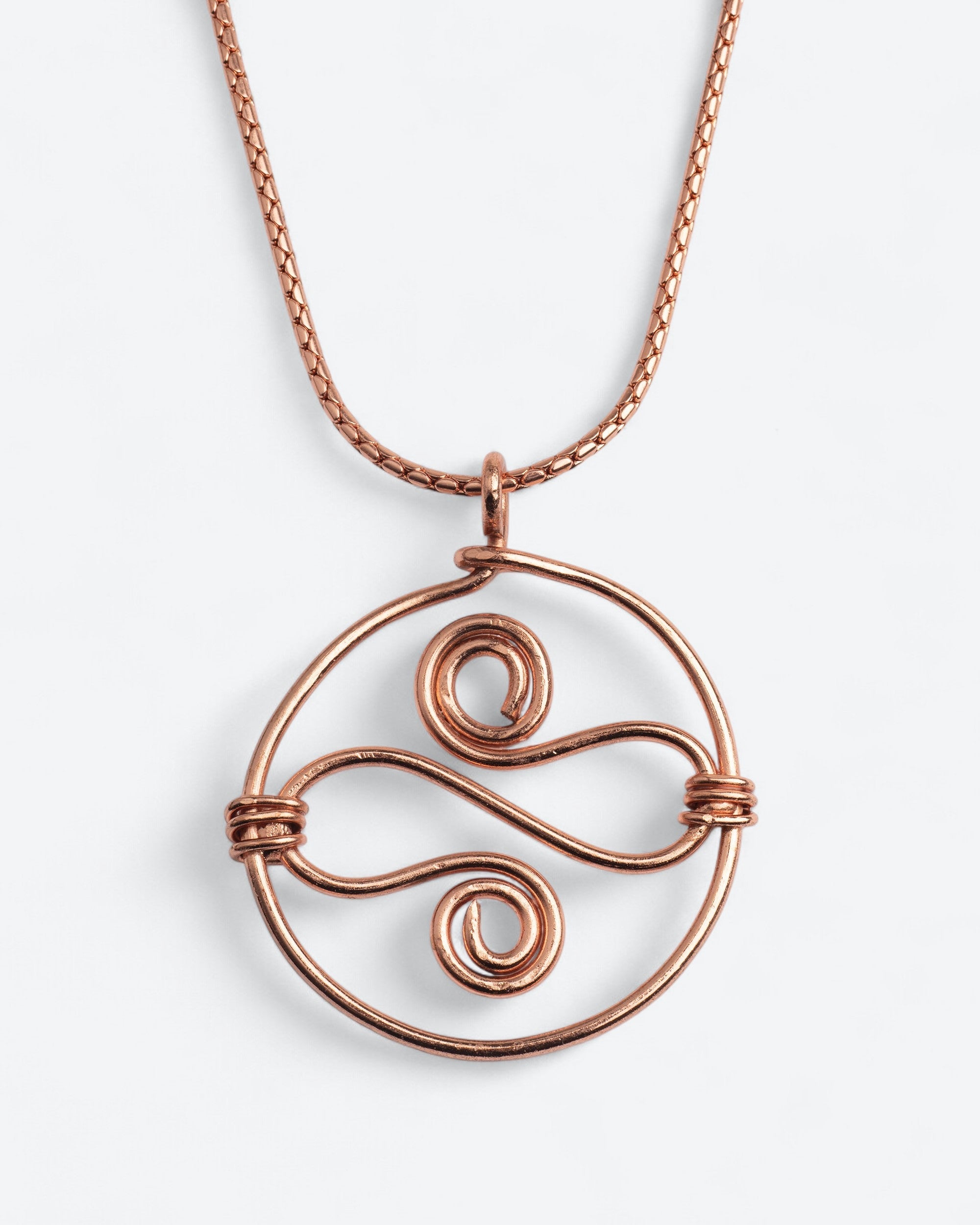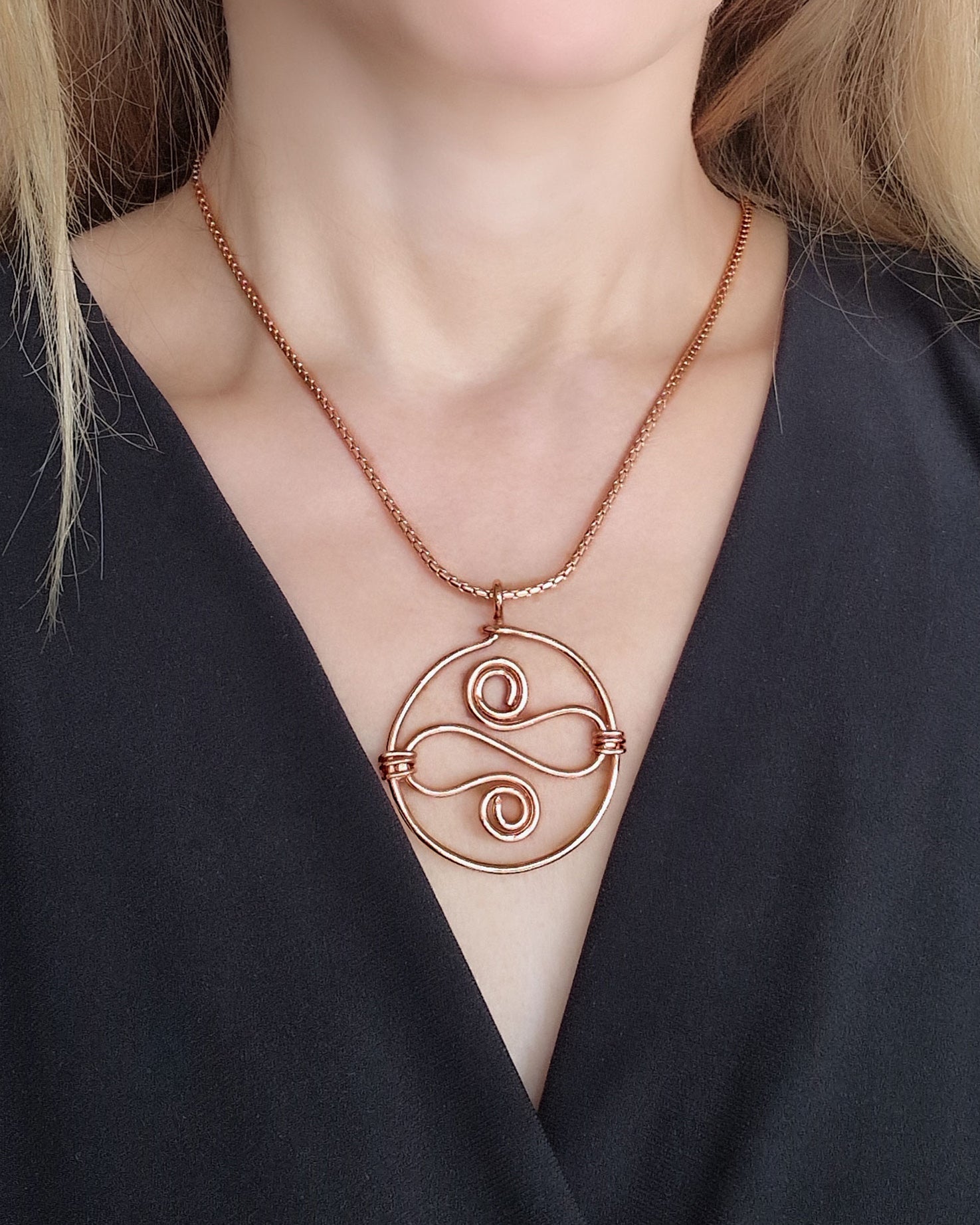 Deze elegante koperen ketting combineert kracht en verfijning. De stevige, glanzende schakelketting draagt een grote sierlijke fantasie hanger die meteen in het oog springt. Het warme koper geeft de ketting een tijdloze uitstraling en versterkt de natuurlijke energie van dit bijzondere metaal.