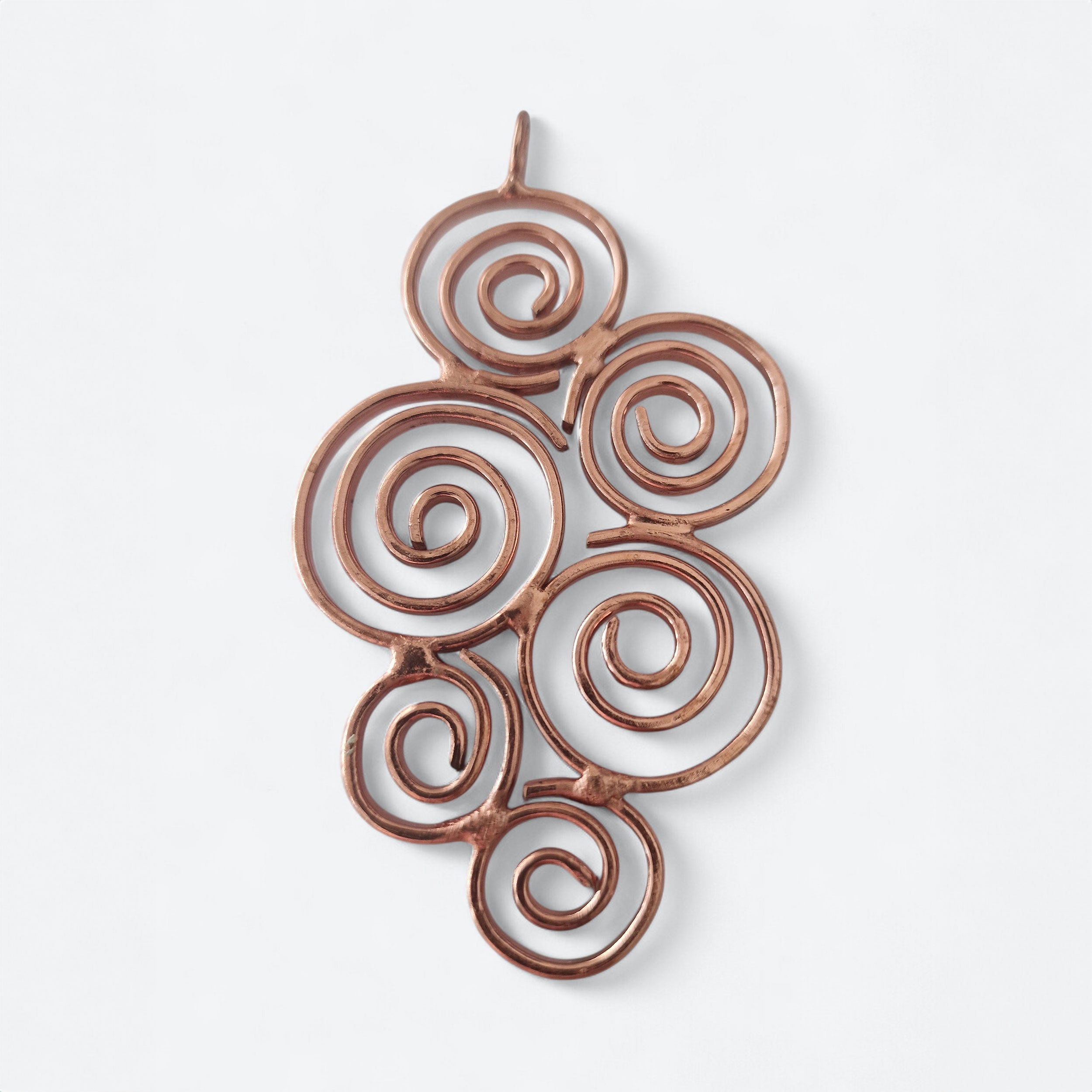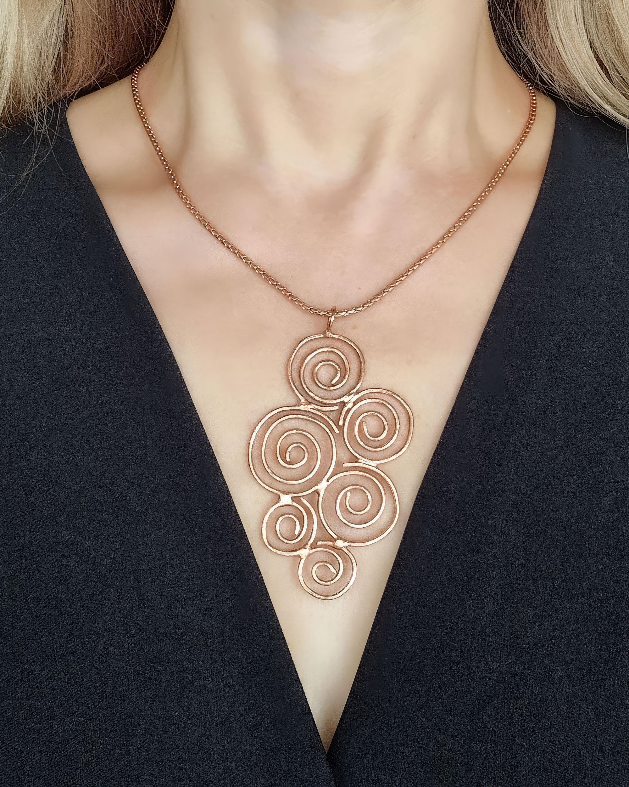 Elegante koperen statement ketting. De stevige, glanzende schakelketting draagt een grote sierlijk gekrulde hanger die meteen in het oog springt. Het warme koper geeft de ketting een tijdloze uitstraling en versterkt de natuurlijke energie van dit bijzondere metaal.