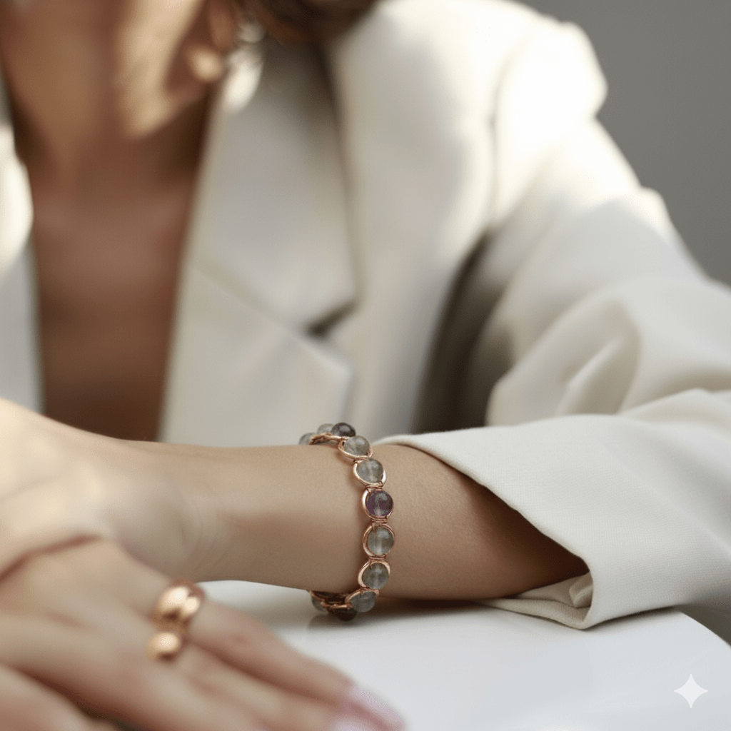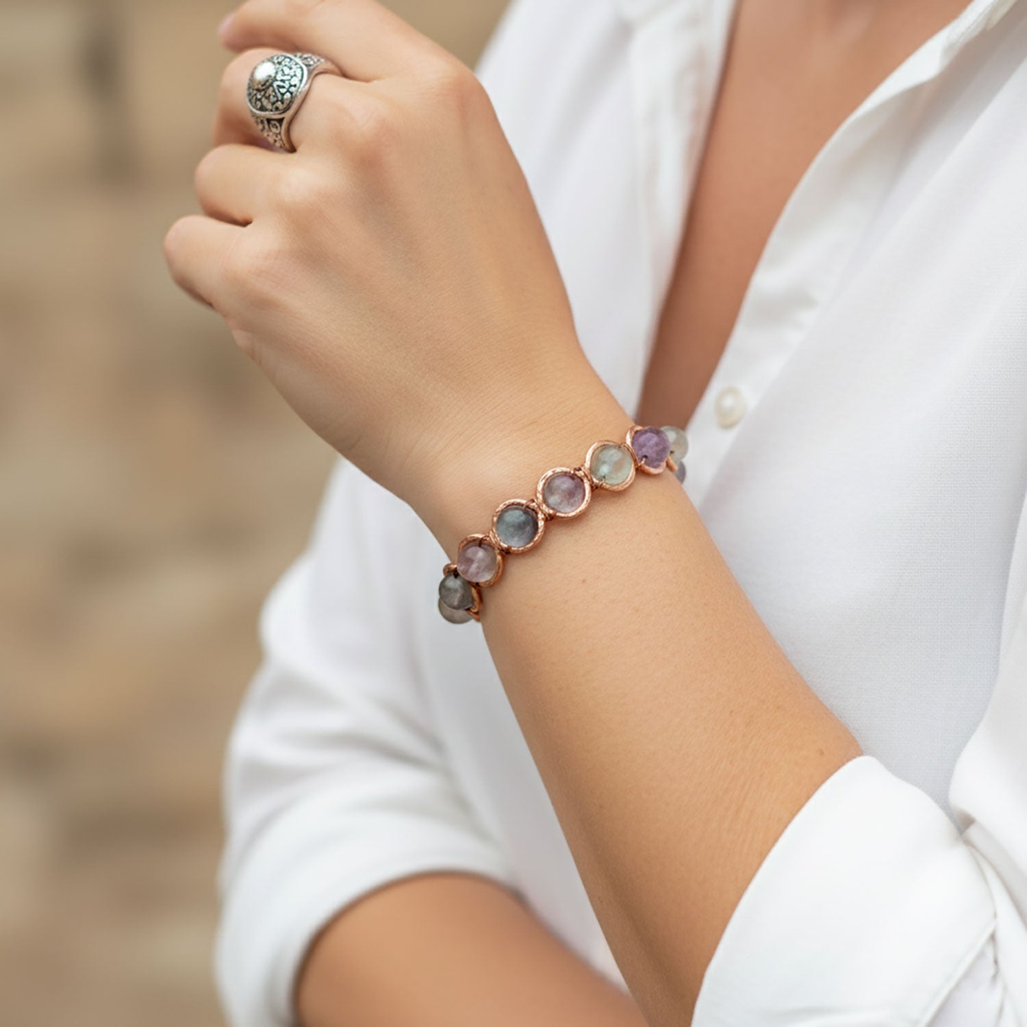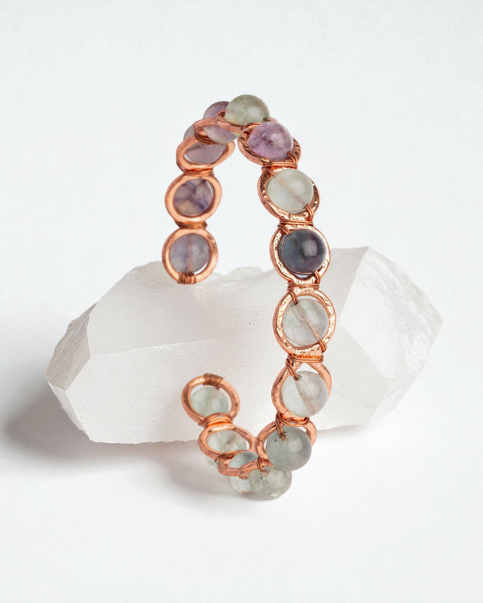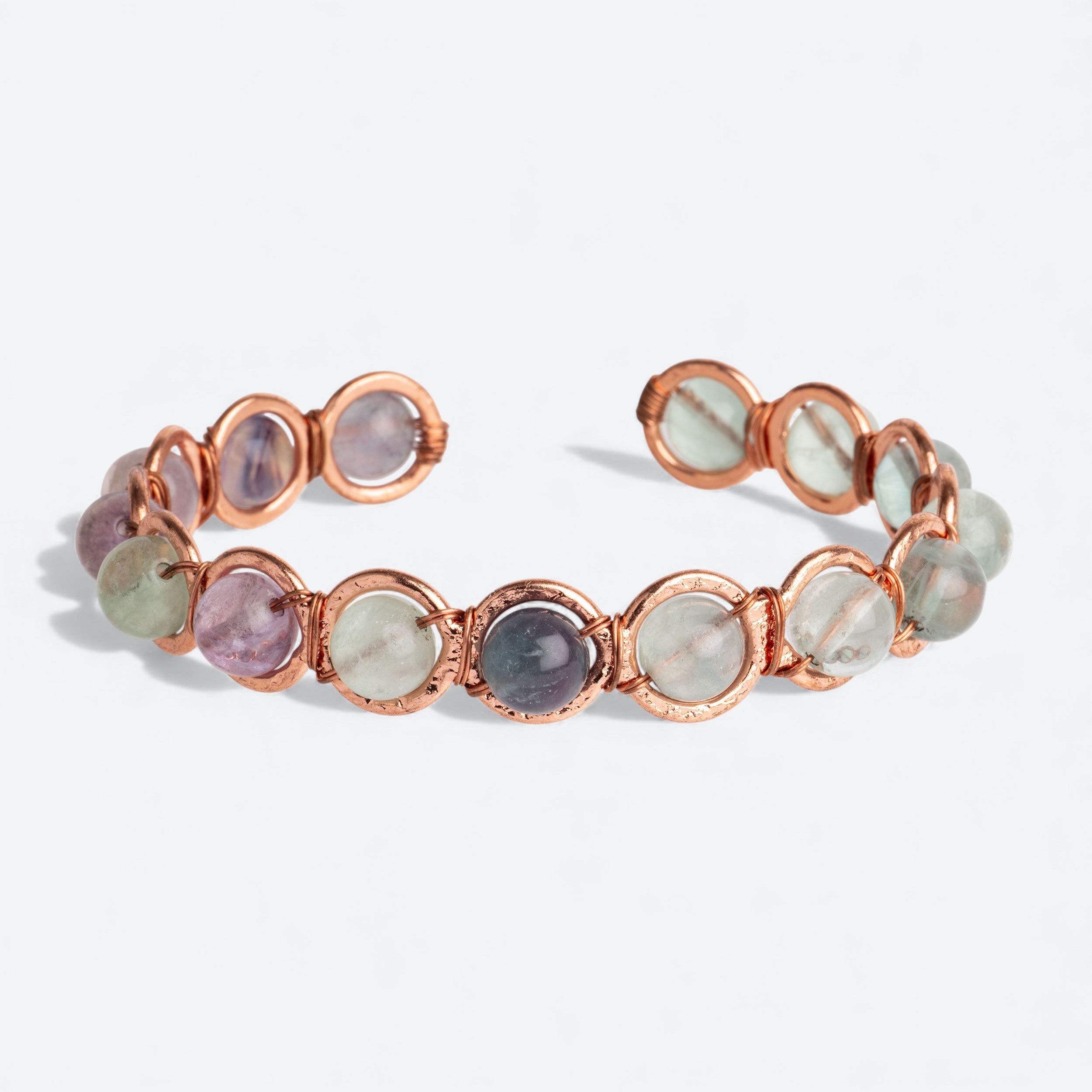 Een verfijnde, handgemaakte armband van warm koper met ronde fluorietstenen van 8 mm. De natuurlijke schakeringen van groen, paars en helder kristal geven elke armband een unieke uitstraling. Fluoriet brengt rust in je gedachten en helpt je focus te bewaren; het koper versterkt deze energie en ondersteunt de natuurlijke doorstroming van het lichaam.