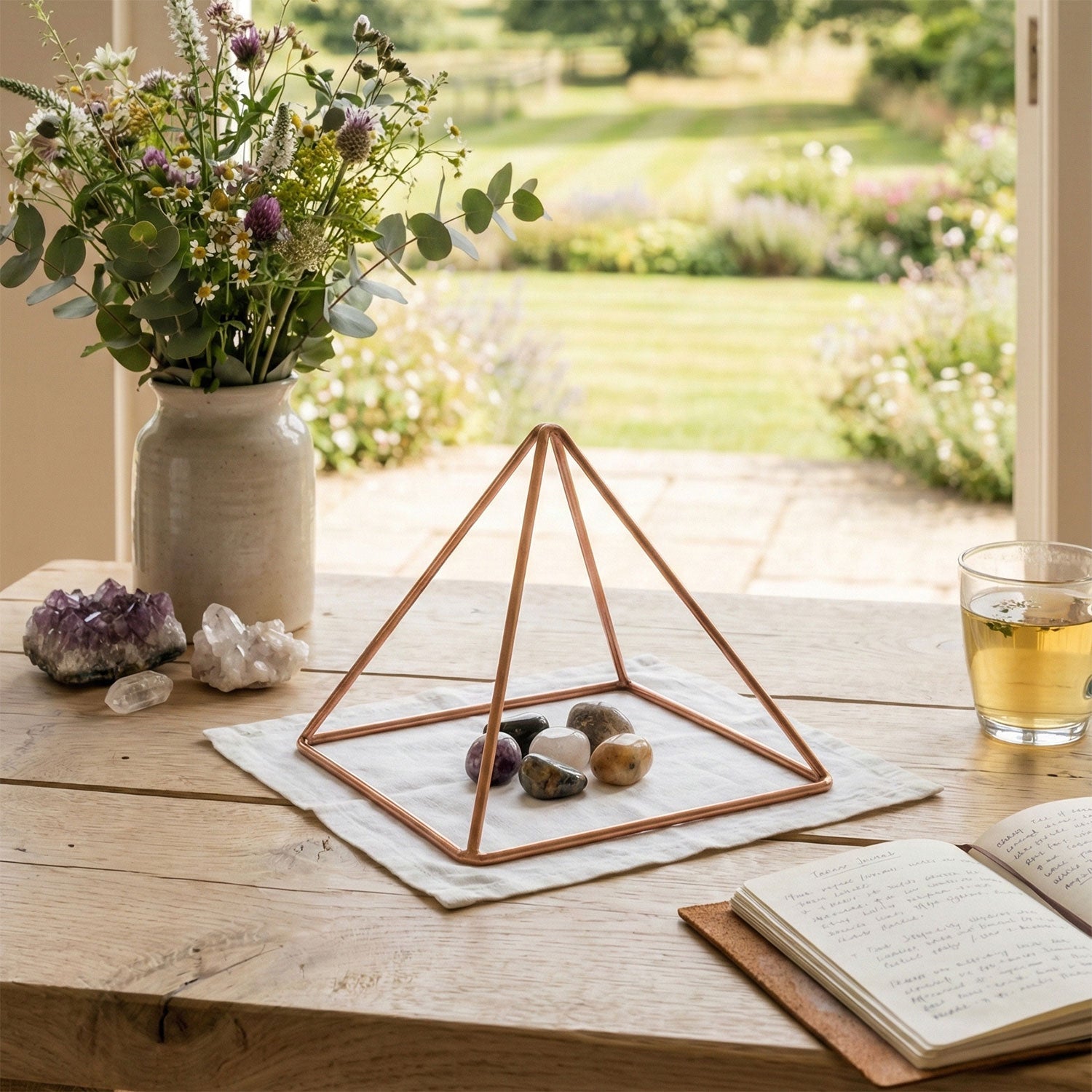 Place the pyramid on your altar, desk, or nightstand to create a harmonizing energy field. Use it to cleanse or charge crystals, during meditation for deeper concentration, or simply as an energetic focal point in your space.