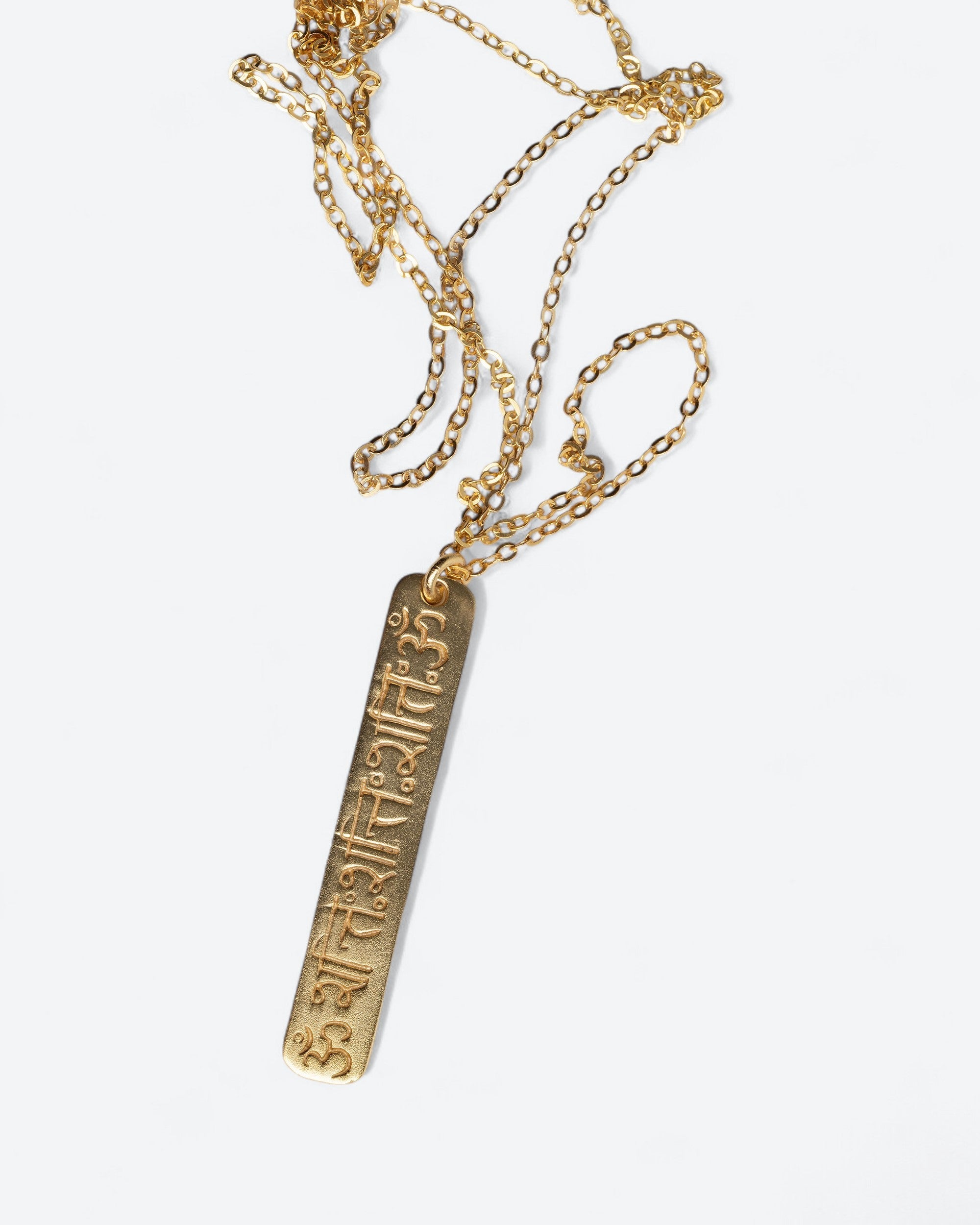 This gold-plated necklace is engraved with the Om Shanti mantra: a piece of jewelry that evokes a moment of pause and a gentle return to yourself. This sacred sound symbolizes peace of body, mind, and soul and is used worldwide in yoga and meditation as an anchor for breath and attention.