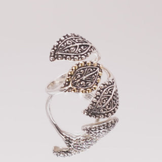 Cette bague en argent sterling 925, fabriquée à la main, est élégamment ornée d'un délicat motif de feuille et subtilement rehaussée de points en or 18 carats. Son design s'inspire du Daun Dewa, aussi appelé plante éternelle, symbole de croissance, de fertilité et du cycle perpétuel de la vie et du renouveau.