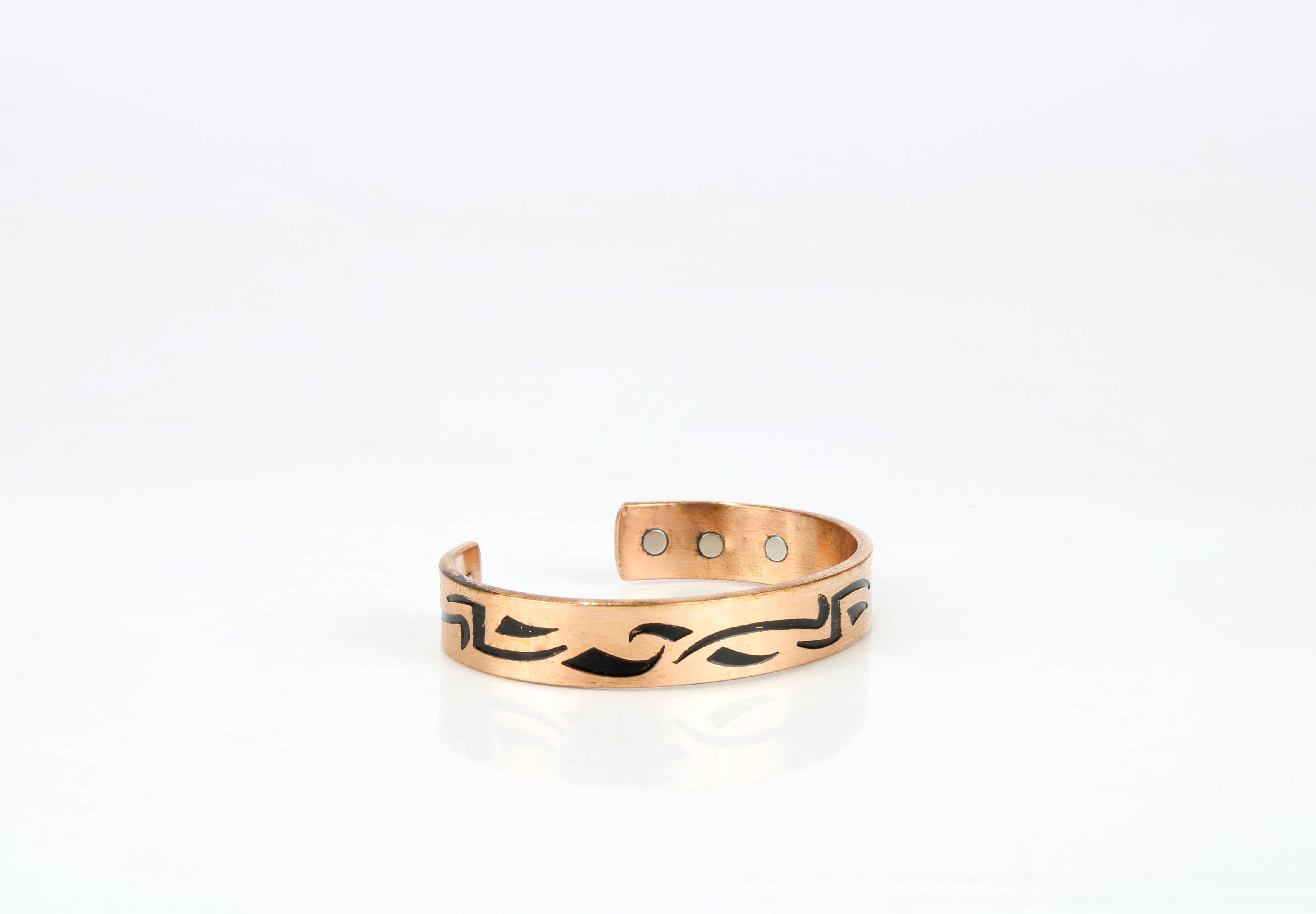 Ce bracelet est en cuivre et doté de petits aimants à ses extrémités. Depuis l'Antiquité, le cuivre et les aimants sont considérés comme efficaces pour soulager l'arthrite et les symptômes rhumatismaux. Grâce à ses vertus curatives naturelles, vous pouvez utiliser le cuivre pour transmettre les propriétés des pierres qui vous entourent. Il active et ouvre également les chakras.
