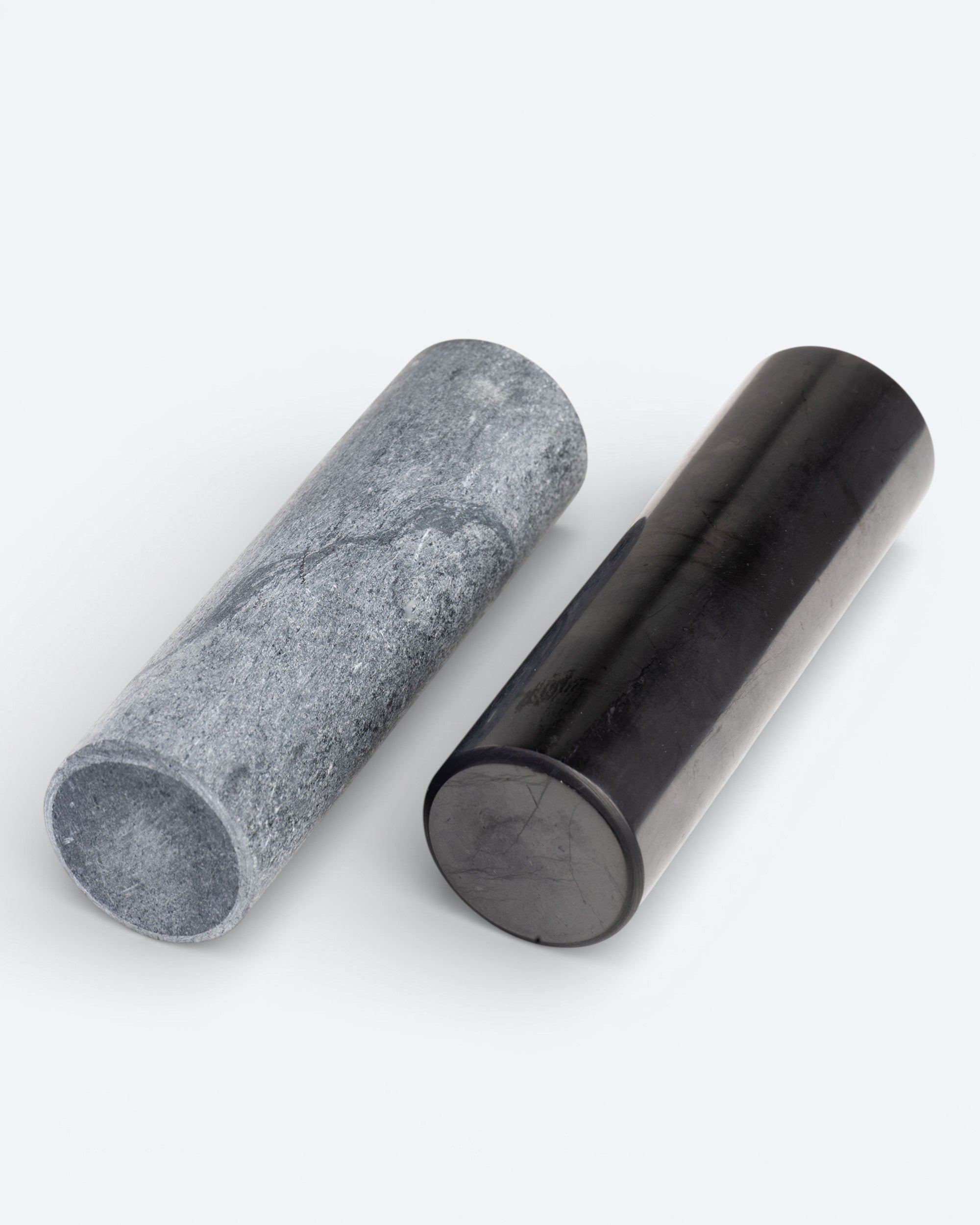 De zwarte shungiet-cilinder geleidt en zuivert energie ; de zachte steatiet stabiliseert en brengt rust. Samen creëren ze een voelbaar evenwicht tussen actie en stilte, ideaal voor meditatie, ontspanning of na een drukke dag.